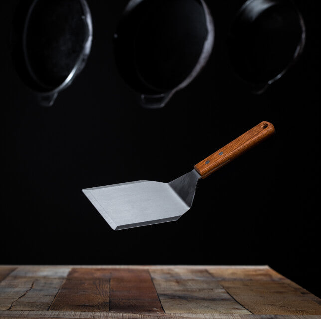 Strong and non-flexible for heavy scraping tasks and making smash burgers. Straight beveled scraping edge creates maximum edge contact, ensuring that even the most stubborn foods release from your cooking surface. Tapered single-piece hardwood handle for comfortable grip and heat resistance.